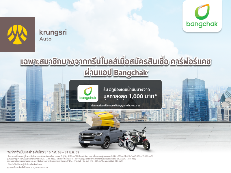 สมาชิกบางจากกรีนไมลส์ สมัครสินเชื่อกรุงศรี ออโต้ ผ่านช่องทางนี้ รับอีคูปองเติมน้ำมันบางจาก มูลค่าสูงสุด 1,000 บาท*