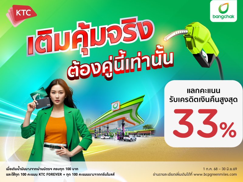 ใช้คะแนน KTC FOREVER + คะแนนบางจากกรีนไมลส์ แลกรับเครดิตเงินคืนสูงสุด 33%*
