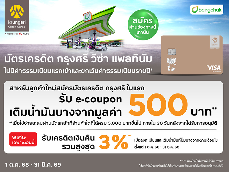 สมัครบัตรเครดิต กรุงศรี รับ e-Coupon เติมน้ำมันบางจาก มูลค่า 500 บาท*