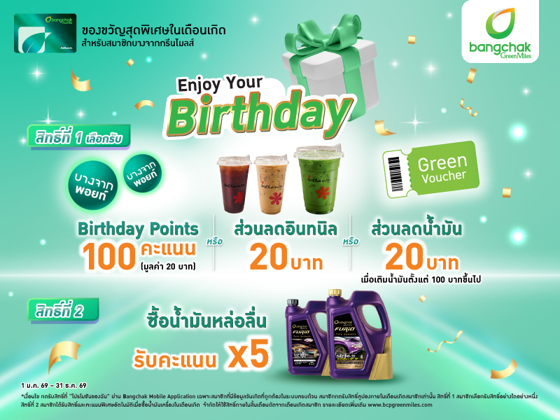 พิเศษ! สมาชิกบางจากกรีนไมลส์รับสิทธิประโยชน์ในเดือนเกิด "Enjoy Your Birthday” ที่ Bangchak Mobile Application