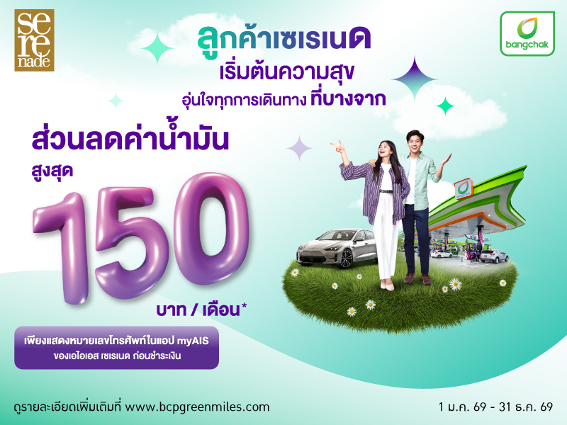 เติมความสุข ทุกเส้นทาง ที่บางจาก ลูกค้าเซเรเนด รับส่วนลดค่าน้ำมันสูงสุด 150 บาท/เดือน*