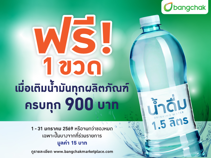 เติมน้ำมันบางจากทุกชนิด ทุก 900 บาท รับฟรีน้ำดื่มขวดใหญ่ ขนาด 1.5 ลิตร 1 ขวด